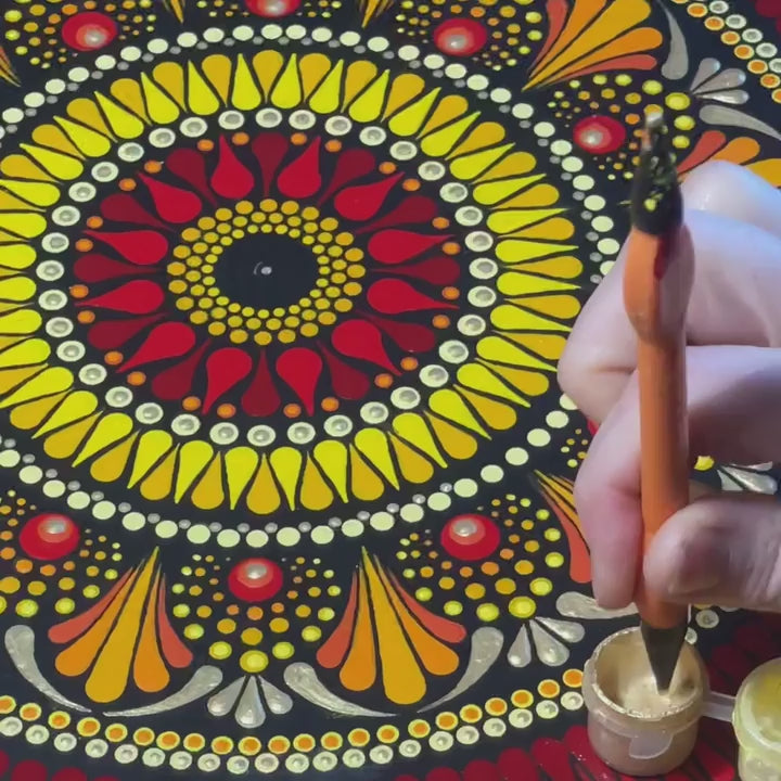 Vibrant, commanding, and alive with powerful momentum, Breath of Fire is a 30-inch mandala created to ignite passion, courage, and a renewed sense of vitality. With its blazing palette of golden yellows, deep crimson reds, rich burgundy tones, glowing oranges, and soft off-whites touched by gold, this piece radiates the energy of transformation and awakening.